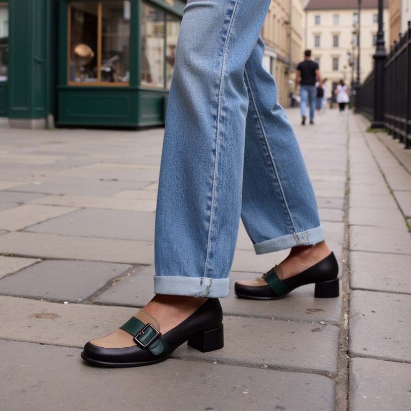 Make a bold statement with these striking color-blocked heeled loafers that perfectly blend classic sophistication with contemporary flair. Crafted from premium smooth leather in a captivating combination of black, warm taupe, and rich emerald green, these shoes elevate the traditional loafer silhouette with artistic color blocking and a comfortable block heel.