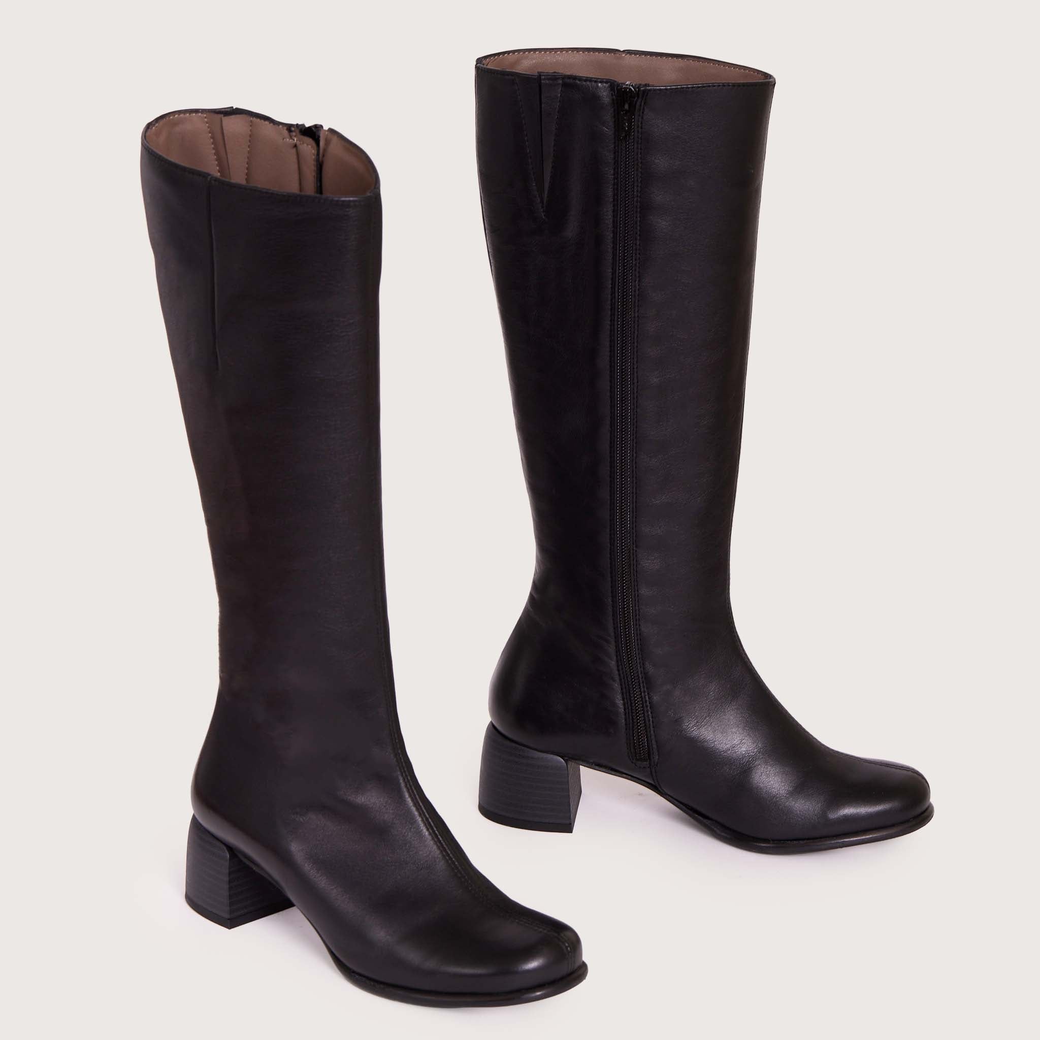 Step into sophisticated style with these stunning knee-high boots that perfectly blend timeless elegance with modern comfort. Crafted in premium black leather with a sleek silhouette and comfortable block heel, these boots are your go-to choice for effortless sophistication all season long.