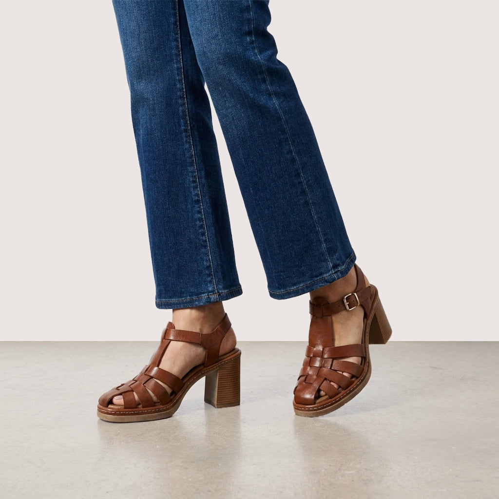 - Premium tan leather upper with woven detailing